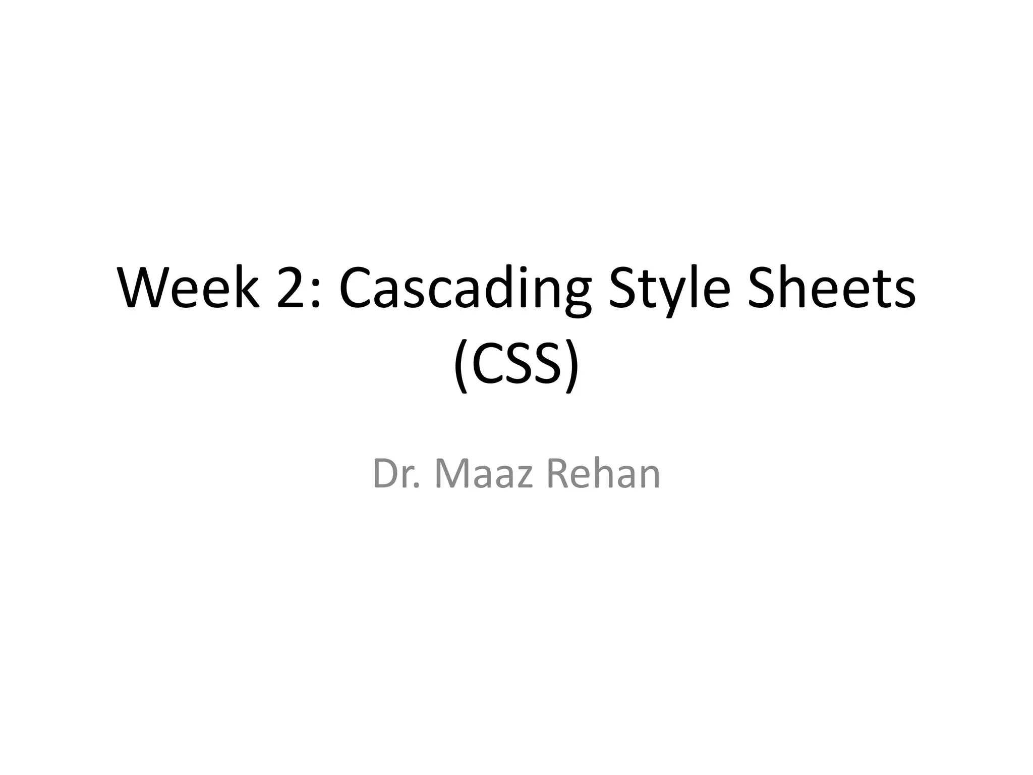 The document discusses Week 2 of a course on Cascading Style Sheets (CSS). It covers topics like what CSS is according to W3Schools, why CSS is used, CSS syntax including selectors, the CSS style tag, and adding CSS through internal, external, and inline styles. Examples are provided of different CSS selectors like the element, id, class, and grouping selectors. The document also discusses CSS comments, HTML tags like <article> and <div>, pseudo-classes, tables, and converting HTML lists into menus with CSS.