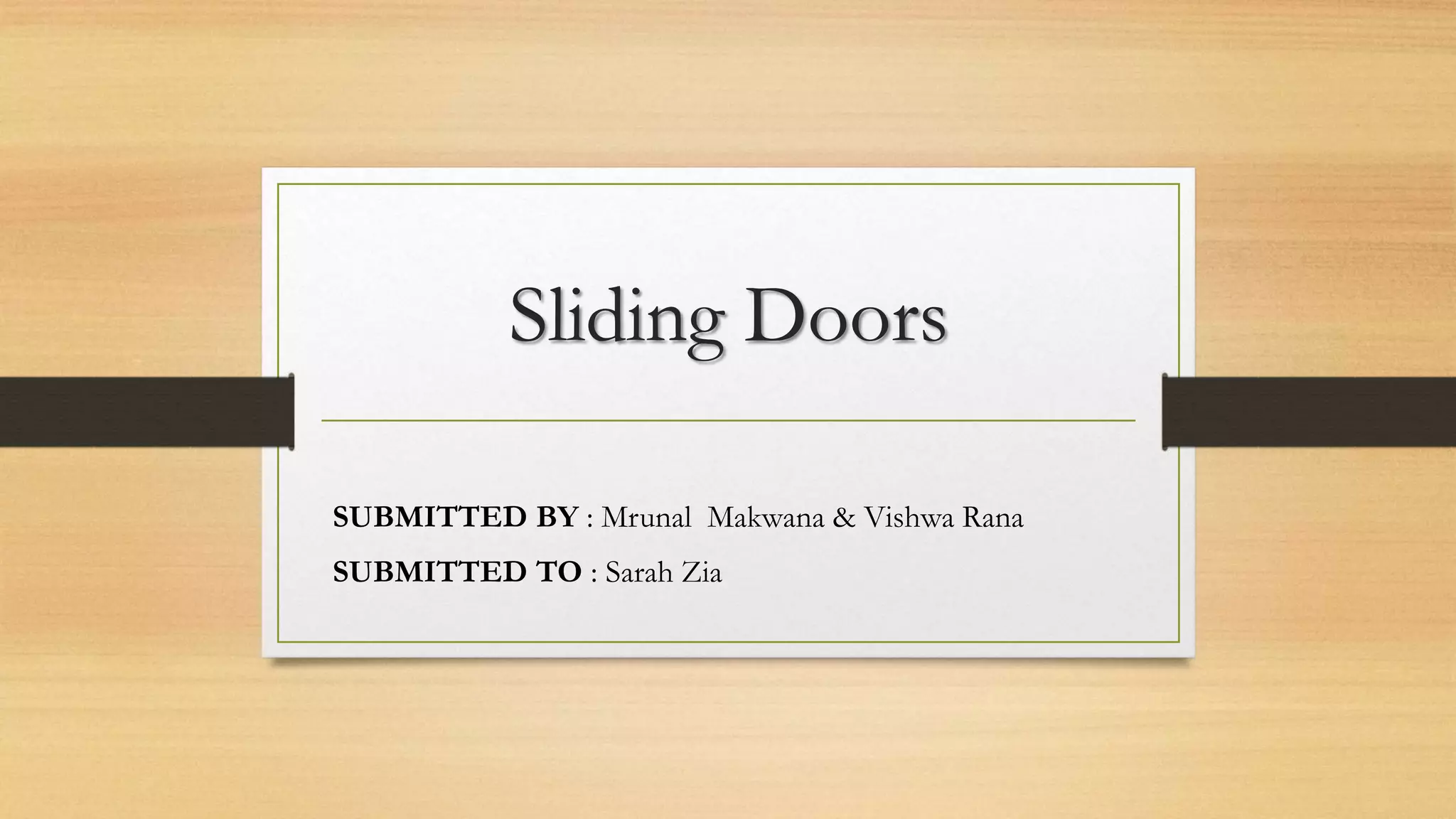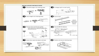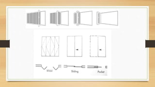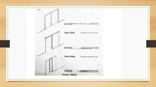 This document summarizes different types of sliding doors. It discusses the history of sliding doors dating back to Roman houses in the 1st century AD. The two main types of sliding door gears are top hung systems and bottom rolling systems. Top hung systems have hangers at the top of the door running in a concealed track, while bottom rolling systems have two rollers at the bottom running on a track. The document also describes different types of sliding doors including bypass doors, surface doors, pocket doors, and bifold doors. Pocket doors slide into pockets in the wall, while bifold doors have hinged panels that fold against each other. In conclusion, sliding doors are easy to use but can be more costly than standard panel doors