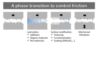 The document discusses using a phase transition in a substrate material to dynamically control friction. A molecular dynamics simulation models a 2D solid with a structural phase transition. It finds that the friction coefficient is non-monotonic near the critical temperature Tc, peaking at Tc. Below Tc, different substrate polarizations result in different friction forces, but this difference disappears near Tc. Increasing load makes friction more sensitive to polarization. The peak in friction at Tc occurs because thermal activation helps the tip kick atoms out of potential wells, aiding dissipation. Near Tc, substrate property correlations diverge, increasing damping and friction.
