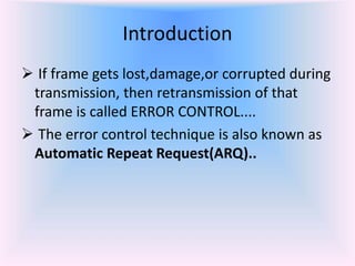 The document discusses different types of Automatic Repeat Request (ARQ) techniques used for error control in data transmission. It describes Stop-and-Wait ARQ, Go-Back-N ARQ, and Selective Repeat ARQ. Go-Back-N ARQ allows sending multiple frames before receiving acknowledgments. If a frame is lost or corrupted, the sender retransmits that frame and all subsequent frames. Selective Repeat ARQ only retransmits the damaged frame, making it more bandwidth efficient but also more complex since the receiver must buffer frames. The sizes of the sender and receiver windows are important parameters that impact the efficiency of the protocols.