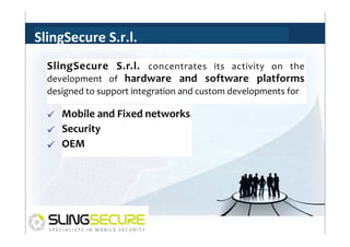 Slingsecure S.R.L. develops hardware and software solutions for mobile and fixed network security, featuring products like the USB Security Token and Micro Secure Environment. Their technology employs advanced encryption methods, secure key management, and diverse application functionalities, supporting integration with various systems. The UST USB device offers features such as secure data storage, encryption, and remote management capabilities, aiming to provide robust security for sensitive information.