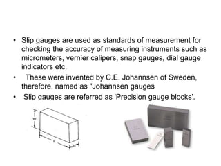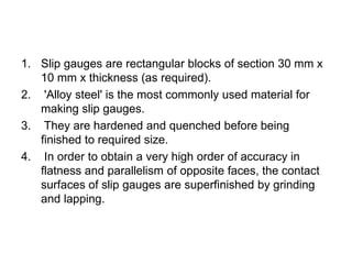 Slip gauges are rectangular blocks made of alloy steel that are used as standards to check the accuracy of measuring instruments. They are hardened, quenched, and superfinished to achieve a very high level of flatness and parallelism on their contact surfaces. Slip gauges are supplied in sets of different sizes so that various length combinations can be obtained through stacking.