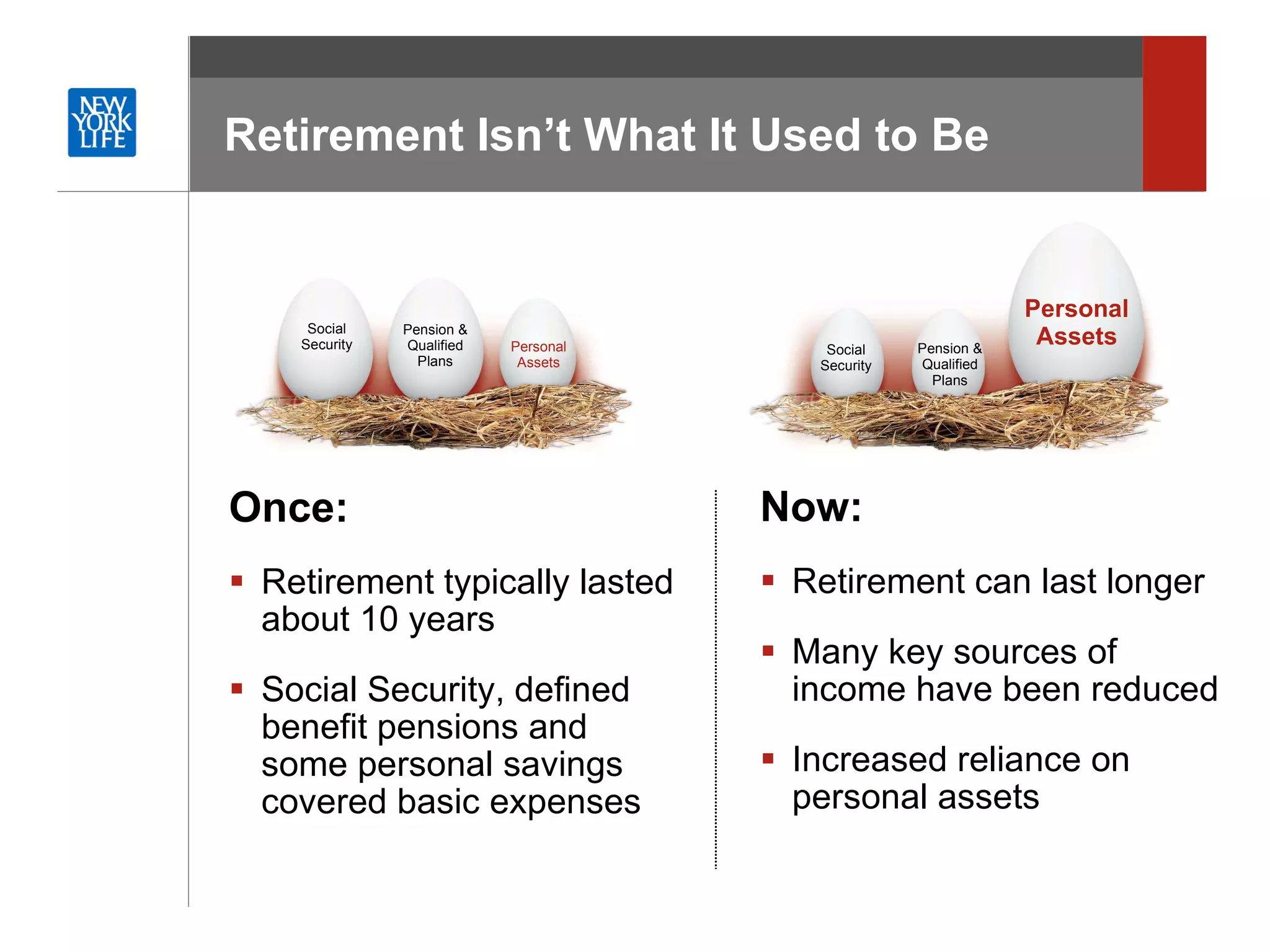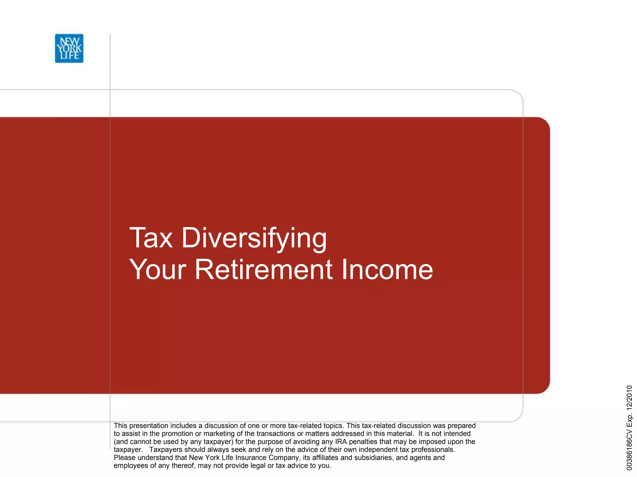 The document discusses strategies for tax diversifying retirement income. It notes that retirement can last longer now while key income sources have been reduced. It recommends placing retirement savings in a variety of tax-advantaged vehicles like Roth IRAs, municipal bonds, cash value life insurance, and traditional IRAs to reduce taxes during accumulation and withdrawal. Cash value life insurance in particular allows tax-free access to policy values before or during retirement.