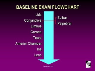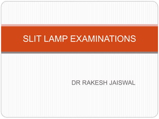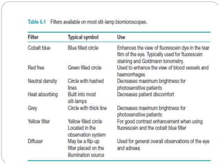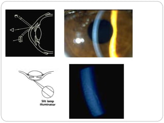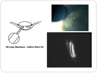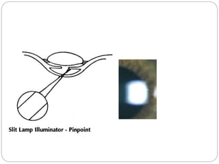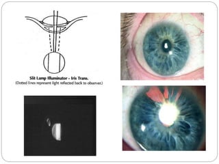 The document discusses slit lamp examinations, which use a high-intensity light source focused as a slit and viewed through a microscope to examine the anterior segment of the eye. It describes the basic components and principles of the slit lamp biomicroscope, various illumination techniques used to examine different ocular structures, and historical developments of the slit lamp.