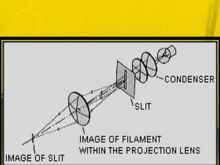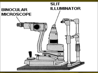 Slit lamps are used to carefully examine the cornea, conjunctiva, and lids of the anterior eye segment. The microscope and light source are coupled so that the same part of the eye being examined is illuminated. This coupling facilitates examination. Main components include the slit lamp microscopes, illumination systems, and mechanical coupling. Attachments allow for fundus examination, gonioscopy, tonometry, laser photocoagulation, and measuring visual acuity in patients with hazy media. Magnification typically ranges from 6x to 40x.