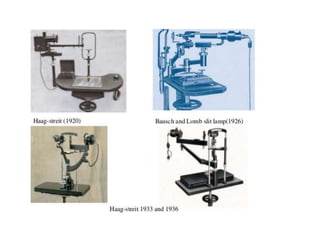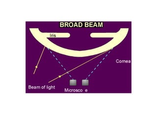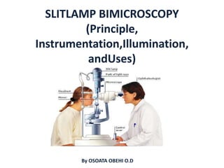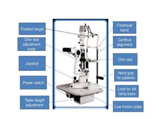 The slit lamp bimicroscope allows for high-magnification examination and evaluation of the anterior segment of the eye. It has three main components: an illumination system using a slit of light, an observation system with binocular lenses, and a mechanical system to position the eye. Various illumination techniques like diffuse, direct, and indirect can be used to examine different ocular tissues. The slit lamp has a long history and continues to be the most important tool for anterior segment evaluation, enabling detection of many abnormalities. Accessories can further aid in examination of structures like the retina, angle, and measurement of eye pressure.