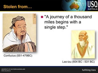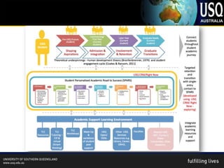 The document outlines the student learning journey at the University of Southern Queensland, emphasizing the importance of quality interactions at various stages from enrollment to graduation. It details current strategies for supporting students, including dedicated personnel and online resources, while also discussing trends in digital content and learning spaces. Additionally, the document highlights the role of staff in enhancing the learning experience and the significance of Communities of Practice in fostering professional development.