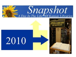 The State Library of Kansas provides library services and resources to all Kansans by collecting and sharing resources and government information, delivering information and solutions, educating librarians and trustees, promoting literacy and reading, and advocating for open access to information. In 2010, the State Library welcomed the governor for a tour of its temporary location in a modular unit near the state capitol building, answered 83 reference questions, had 31 people using public computers and wifi, circulated 565 items, and had 60 visitors.
