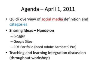 This document provides an overview and hands-on activities for using social media tools for sharing ideas. It defines social media and categories including sharing ideas. It then demonstrates how to use blogging platforms like Blogger and sites for creating and sharing content. Hands-on activities guide attending learning to set up blogs and websites. PDF portfolios are also introduced as a format for sharing ideas. The document aims to help participants integrate social media into teaching and learning.