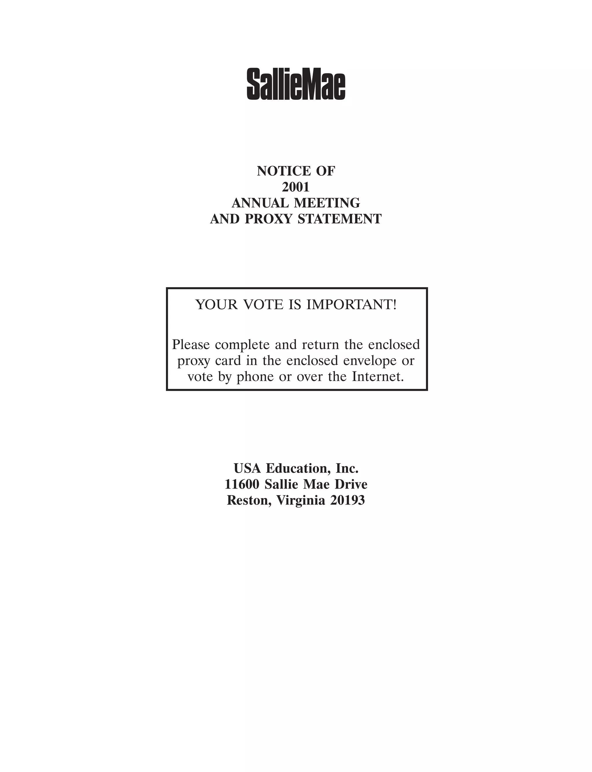 This document is a notice and proxy statement for USA Education Inc.'s 2001 annual meeting of shareholders. It notifies shareholders that the meeting will be held on May 10, 2001 to elect directors, vote on increasing authorized shares of common stock, ratify auditors, and conduct other business. It provides information about each item of business, the board of directors, executive compensation, and share ownership. Shareholders are urged to vote by proxy to establish a quorum for the meeting.