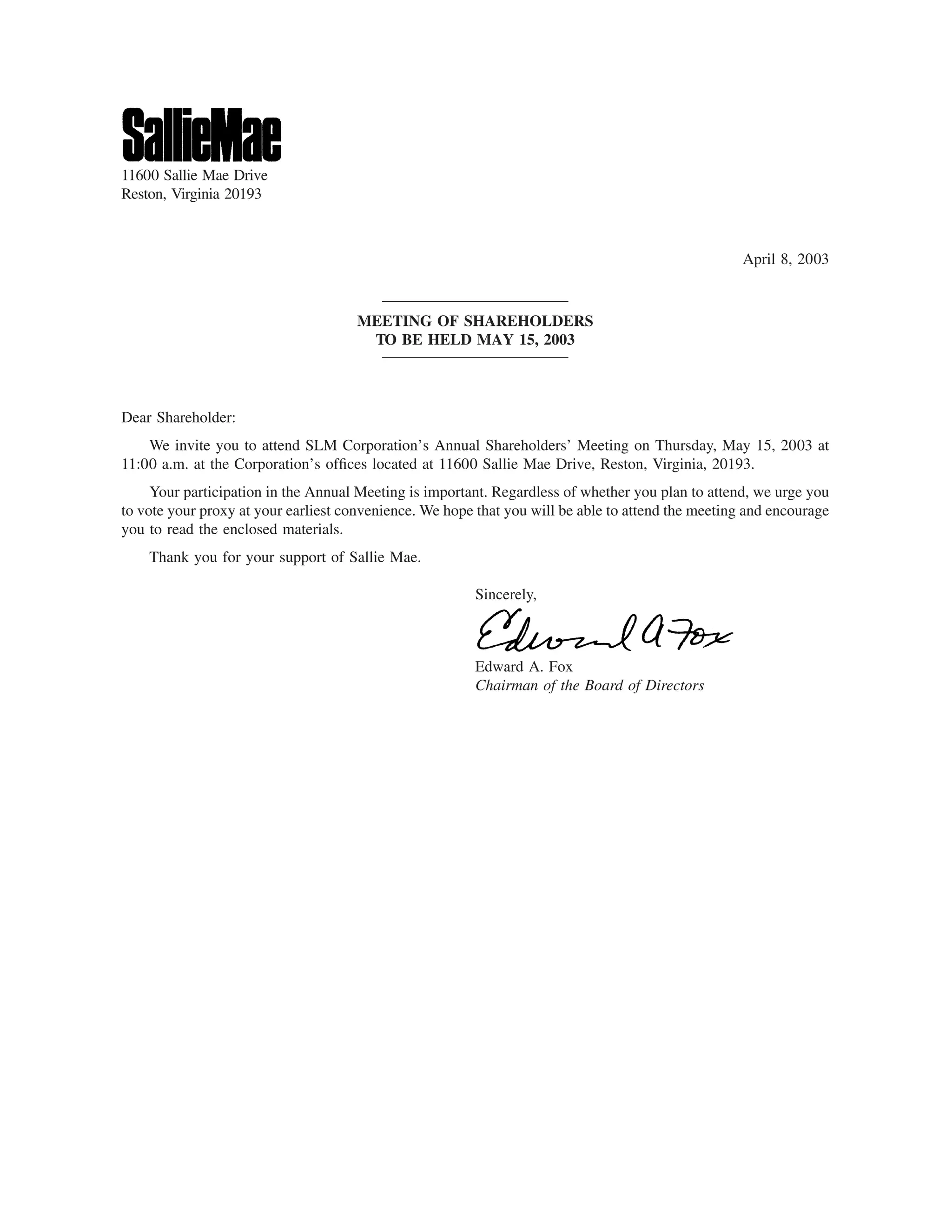 - SLM Corporation will hold its Annual Shareholders' Meeting on May 15, 2003 at 11:00 am at its offices in Reston, Virginia. - Shareholders are being asked to vote on electing the Board of Directors, amending the corporation's certificate of incorporation to increase authorized shares, and ratifying the appointment of PricewaterhouseCoopers LLP as independent auditors. - Shareholders who owned stock as of March 17, 2003 are eligible to vote, and the meeting details and voting procedures are provided.
