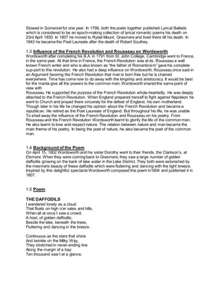 This document provides context and analysis of William Wordsworth's poem "Daffodils". It discusses Wordsworth's life and influences, including the French Revolution. It then summarizes the background of the poem, analyzes each stanza, and discusses Wordsworth's appreciation of nature and how it inspired this work.