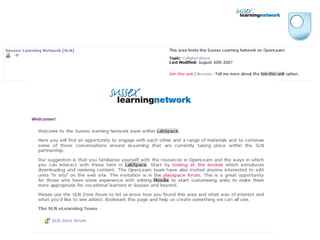The SLN eLearning project aimed to promote lifelong learning in Sussex, England using online resources. The Open University participated by providing eLearning experts to help develop online content and training events. They used OpenLearn, the OU's open educational resource platform, to create learning materials, host discussions, and share project resources. Through workshops and online spaces on OpenLearn and other sites, the team explored how digital tools could support the SLN's educational outreach and collaboration between partner institutions. While questions remained, OpenLearn proved a successful platform for this type of multi-institutional eLearning partnership.