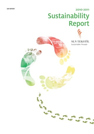 This sustainability report from SLN provides an overview of the company's operations and sustainability performance from 2010-2011. SLN is a leading Turkish textile and apparel company with 350,000 unit/month apparel production capacity and 15 tonnes/day dye production capacity. The report discusses SLN's approach to sustainability, stakeholder engagement, economic and environmental impacts, and social initiatives. Key highlights include investing in a new dye house to improve quality, speed and pricing, implementing lean production programs, and measuring water and carbon footprints to track environmental impacts.