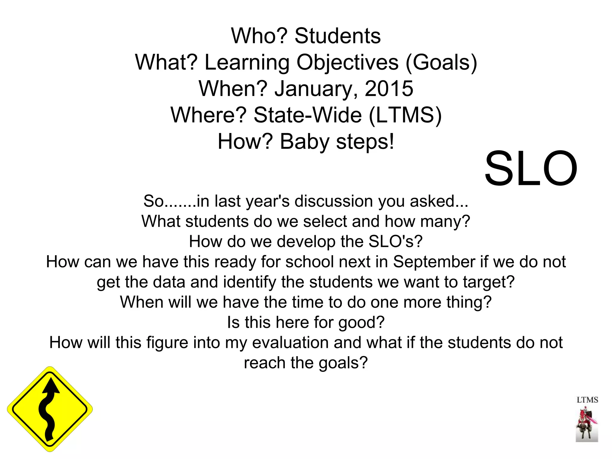 This document provides information about student learning objectives (SLOs) to teachers at Loyalsock Township Middle School. It explains that SLOs are academic goals set by teachers for groups of students to be achieved by January 2015. The document reviews questions teachers had previously about developing SLOs and addresses how to make them specific, measurable, attainable and aligned to standards. It provides an example of an SLO and outlines next steps, which include further training in September and completing section 1 of the SLO template.
