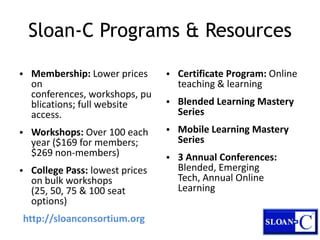 The Sloan Consortium (Sloan-C) provides resources and events to support online and blended learning. Their programs include membership options, workshops, certificate programs, conferences, webinars and more. Upcoming events focus on topics like student satisfaction, ePortfolios for STEM learning, and the annual international conference on online learning. Sloan-C promotes quality online education through their 5 Pillars framework, which emphasizes learning effectiveness, access, scale, faculty satisfaction and student satisfaction. Resources are available to help educators understand and apply this quality framework.