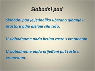 Dokument objašnjava slobodni pad kao jednoliko ubrzano gibanje pod utjecajem sile teže, s formulama za brzinu i visinu. Također se raspravlja o sili teže i težini tijela te definira elastična sila kao odgovor opruge na istezanje. Sila trenja se opisuje kao sila koja koči gibanje tijela, ovisna o vrsti dodirnih površina.