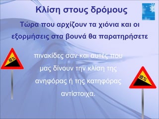 Κλίση στους δρόμουςΤώρα που αρχίζουν τα χιόνια και οι εξορμήσεις στα βουνά θα παρατηρήσετε πινακίδες σαν και αυτές που μας δίνουν την κλίση της ανηφόρας ή της κατηφόρας αντίστοιχα.