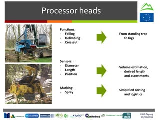The document discusses processor heads for logging machines and quality assessment of logs. Processor heads are used for felling, delimbing, and crosscutting trees. Sensors can measure diameter, length, and position. Marking and sorting by volume, length, and assortment allows for simplified logistics. Quality is assessed visually in the forest and with sensors in sawmills. A concept for an intelligent processor head includes sensors like NIR, hyperspectral imaging, RFID, and stress waves to interact with databases, measure loads and volumes, and provide full traceability and quality assessment of individual logs. RFID marking associates quality indexes to logs for full traceability of timber products.