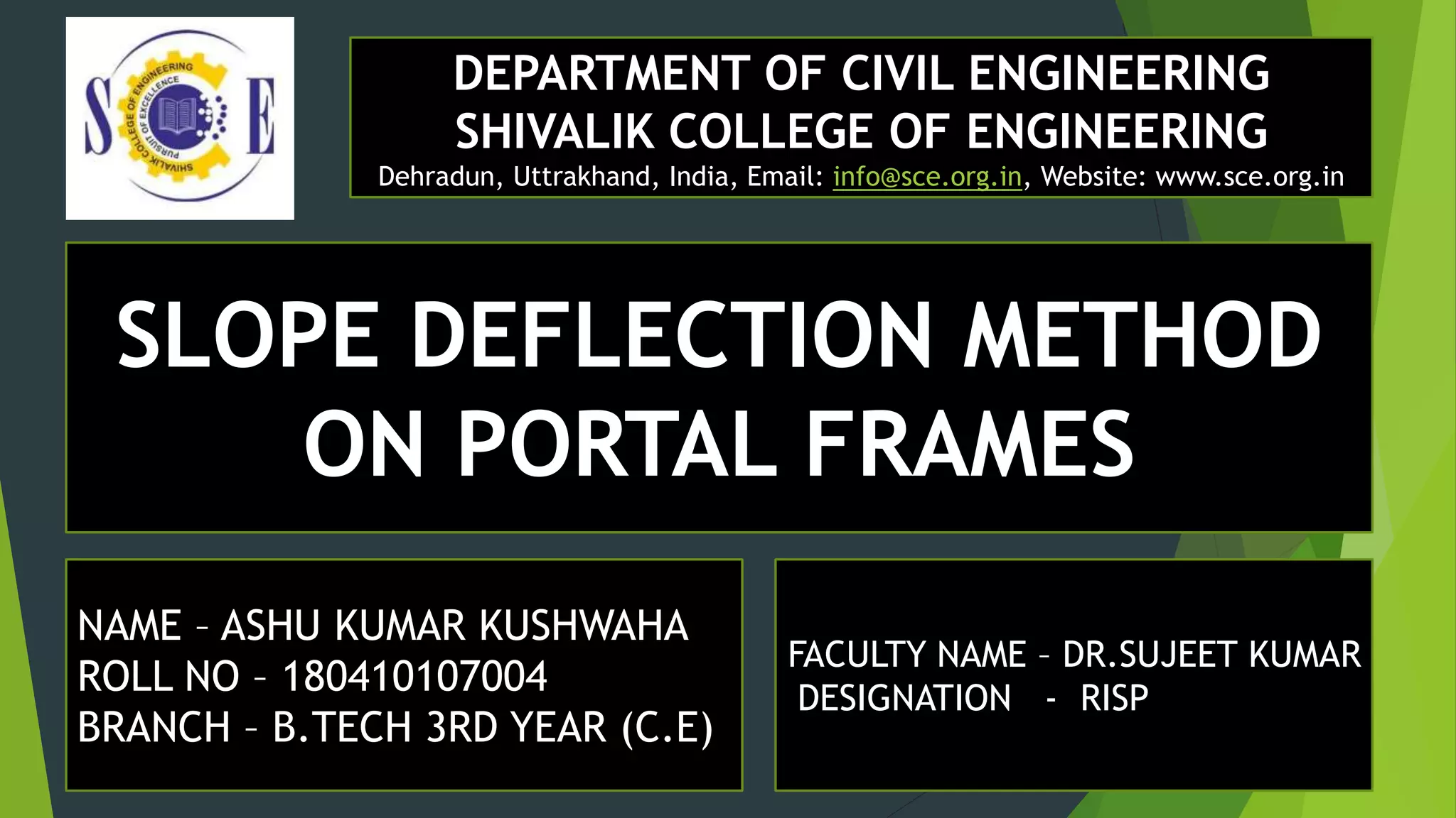 This document presents the slope deflection method for analyzing statically indeterminate beams and frames. It discusses the assumptions of the method, which include rigid joints and neglecting distortions from axial and shear stresses. Examples are provided to demonstrate solving for unknown joint rotations and displacements using equilibrium equations, then determining final end moments and drawing shear and bending moment diagrams. Portal frames are discussed, including how side sway can be accounted for in the analysis.