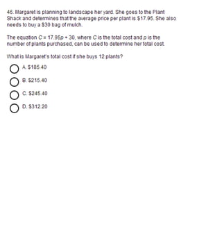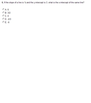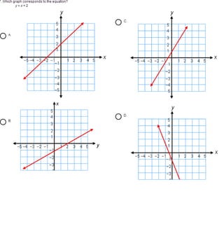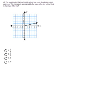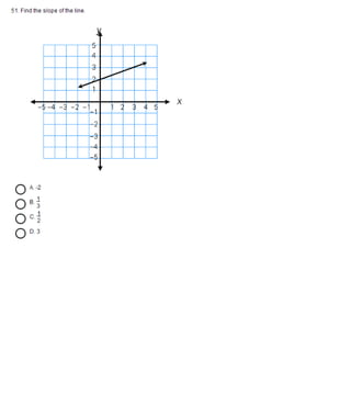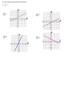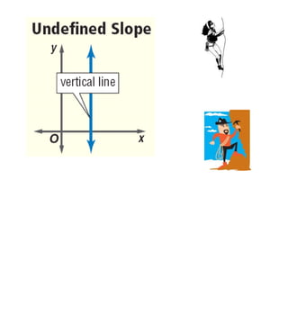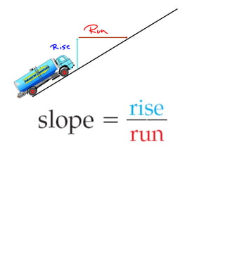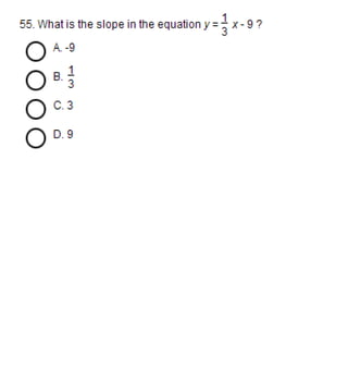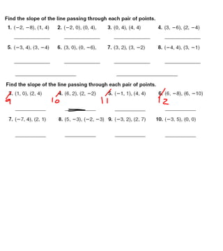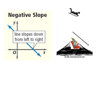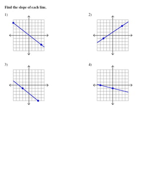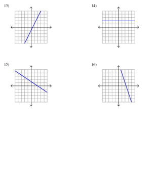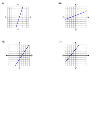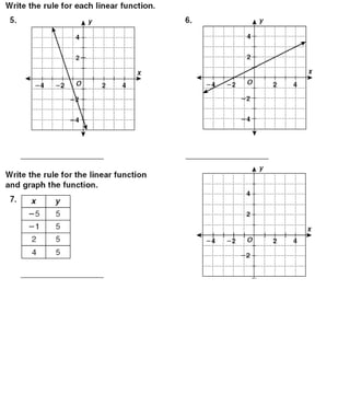 The document provides examples and explanations of key concepts related to linear functions in slope-intercept form (y = mx + b). It includes examples of finding the slope and y-intercept from graphs, equations, and point pairs. Practice problems are provided for students to identify slopes, match equations to graphs, find the equation from two points, and determine if a relationship represents a function.