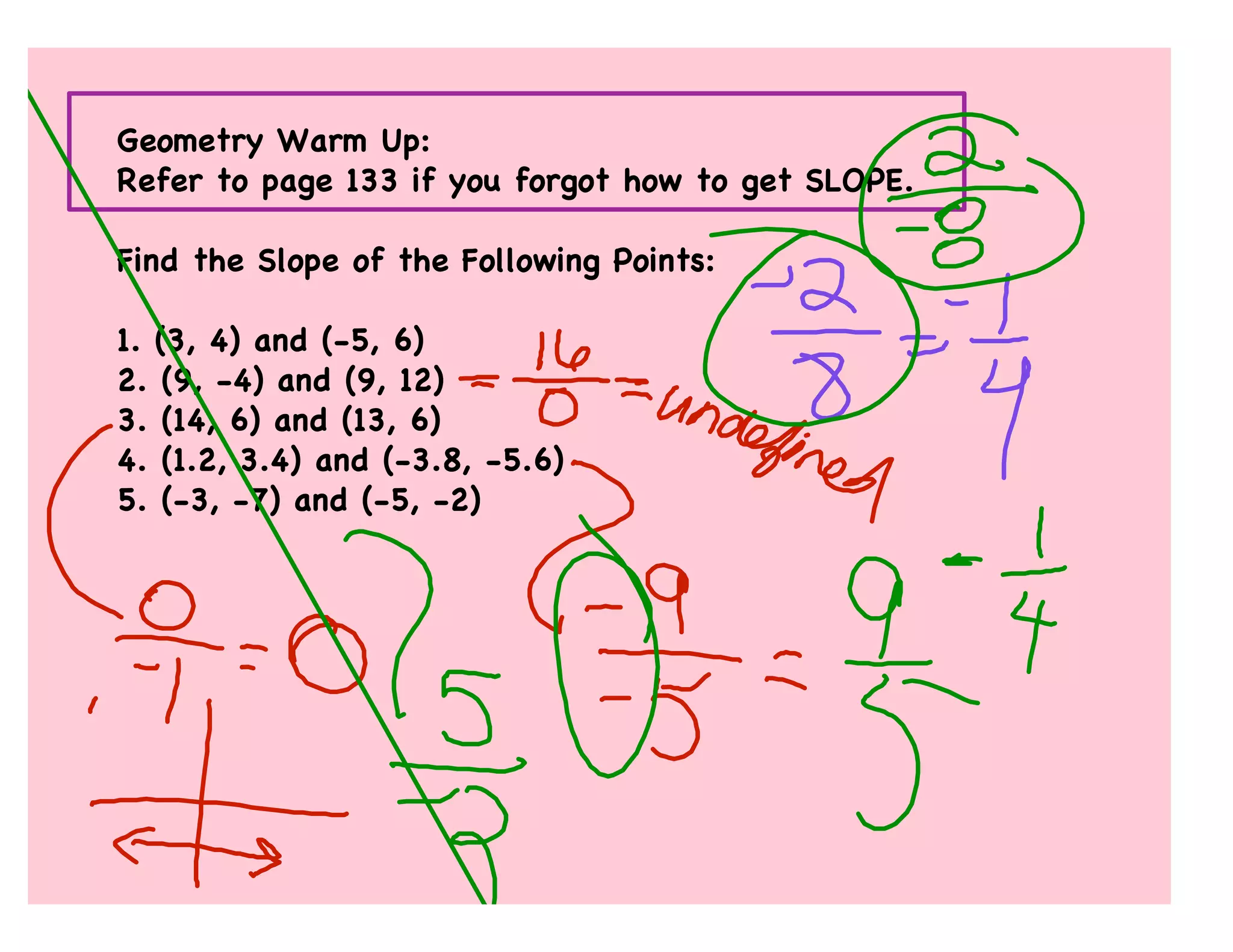 The document provides geometry problems and instructions for finding the slope of lines between given points. It directs the reader to reference pages for calculating slope and determining if lines are parallel, perpendicular, or neither. Examples and practice problems are presented for the reader to work through with group members.