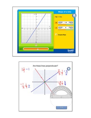 This document provides a lesson on perpendicular lines for algebra students. It begins with defining perpendicular lines as two lines whose slopes are opposite reciprocals. It then reviews slope-intercept form and how to determine the slope of a line from its graph. Students are asked to determine whether pairs of lines are perpendicular based on their slopes. Examples of perpendicular lines in the classroom are also discussed. The lesson aims to teach students how to identify if two lines are perpendicular and find the perpendicular slope to a given line.