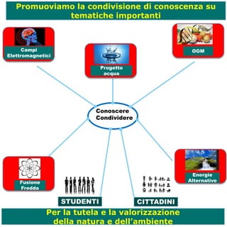 Il documento evidenzia l'importanza della condivisione della conoscenza su tematiche riguardanti la tutela e valorizzazione della natura e dell'ambiente. Viene messa in risalto la necessità di informare e coinvolgere cittadini e studenti riguardo a temi come le energie alternative, la fusione fredda, i campi elettromagnetici, il progetto acqua e gli OGM.