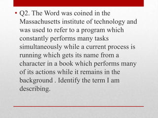 The document provides clues and questions about various technology companies, products, and people. It describes the origins of companies like Facebook, Microsoft, and Hewlett-Packard. It also references programming languages like Pascal and the concept of multitasking. The document tests knowledge of history, founders, mergers, and key events related to major players in the tech industry.