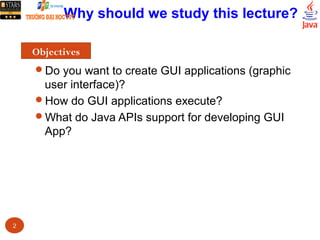 This document discusses creating graphical user interfaces in Java. It covers two types of applications, event-based and console applications. It describes Java's model for event management using listeners and handlers. It also discusses the Java Foundation Classes for building GUIs, including Swing components, internationalization support, and look and feel customization. The document provides a strategy for designing GUIs and examples of using common Swing components like JLabel, JButton, and JComboBox.