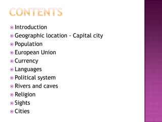 This presentation provides an overview of Slovakia, including its geographic location in Central Europe bordering several countries, population of over 5 million, and status as a member of the European Union and Eurozone. Key details mentioned include Bratislava as the capital city, Slovak as the official language, majority Roman Catholic religion, and popular tourist sights such as Bratislava Castle.