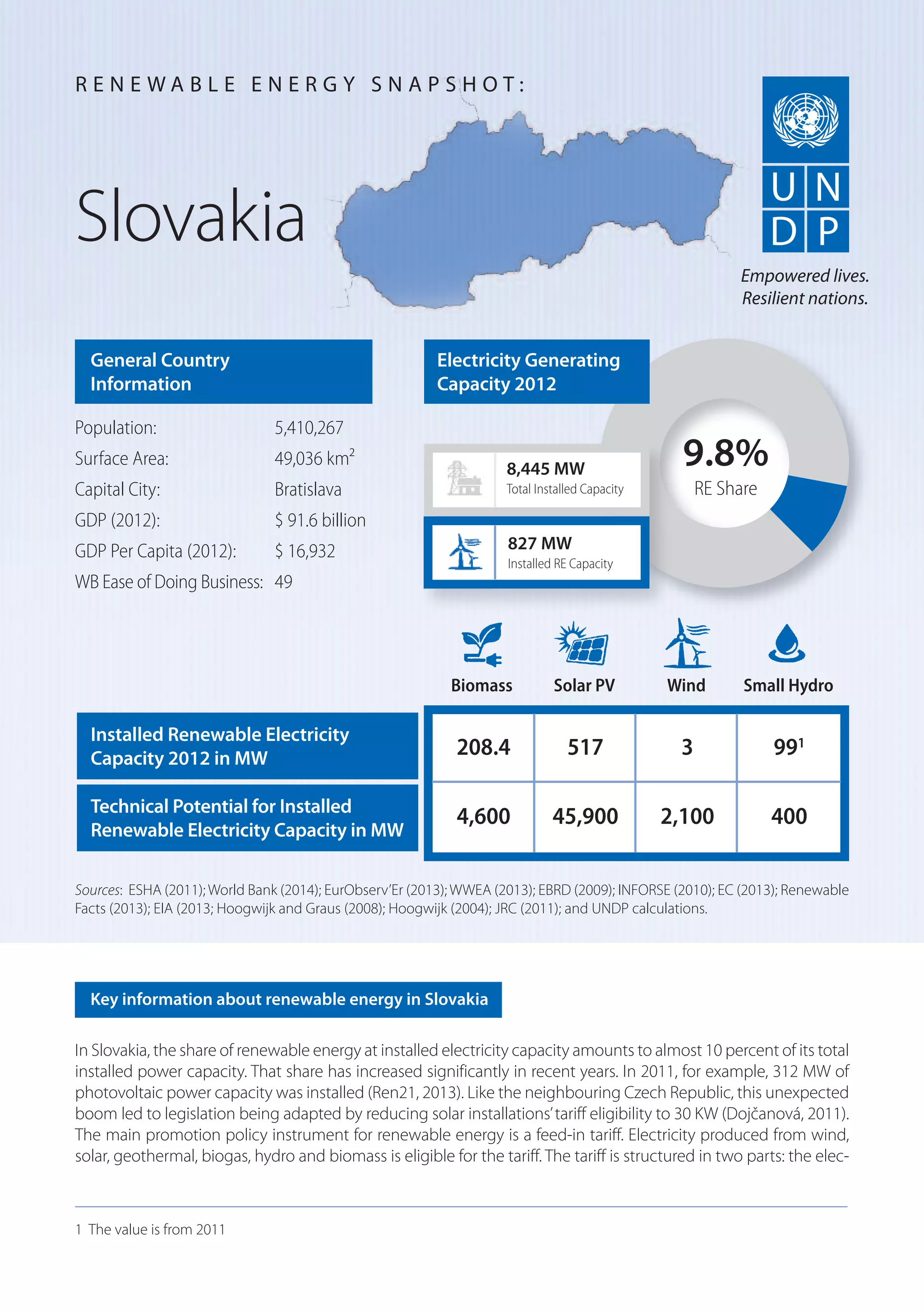 In Slovakia, renewable energy accounts for almost 10% of total installed electricity capacity. Solar PV capacity increased significantly in recent years, reaching 312 MW installed in 2011, until legislation reduced tariff eligibility for solar installations to 30 kW. The main policy support for renewable energy is a feed-in tariff program that pays a premium price for electricity generated from wind, solar, geothermal, biomass, hydro, and biomass. The tariff is structured in two parts and applies for 15 years except for installations under 1 MW which receive the tariff for their lifetime.