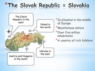 The document provides information about the country of Slovakia. It describes Slovakia's location in Central Europe, population size, natural features including mountains, caves, and dams. Key cities mentioned include Bratislava as the capital and details about landmarks such as Bratislava Castle. The document also discusses the Tilgnerova School, named after sculptor Viktor Tilgner, and mentions facilities at the school like its buffet and canteen. It notes that children at the school make projects about Slovakia.
