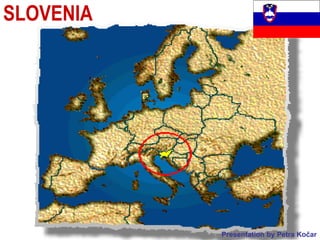 Slovenia is a country located in Central Europe. It has a population of around 2 million people and borders Austria, Croatia, Hungary, and Italy. The climate varies from Alpine in the northwest to Mediterranean along the coast. Some notable aspects of Slovenian culture presented include the national anthem, folk costumes that differ by region, traditional folk games like "Chris Cross King Matias" and "Fox and Hens", and folk dances such as "Abraham's Got Seven Sons" and "Marko's Jumping."