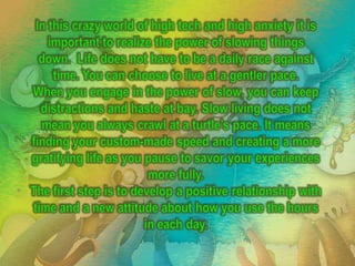 This document provides 21 tips for slowing down and enjoying life more. Some of the key tips include embracing time abundance by knowing you have enough time, creating openings by saying no sometimes, relishing the space between activities, disengaging from constantly checking the time, inviting flow by losing track of time with hobbies, eating mindfully, switching off technology occasionally, redefining leisure as important for productivity, rekindling childhood interests, taking full days off not just half days, spending 30 minutes outdoors daily, and focusing on enjoying the present moment instead of sweating small details.
