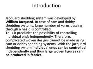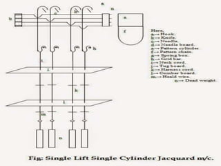 The document is a detailed presentation on the Single Lift Single Cylinder (SLSC) Jacquard system, highlighting its capabilities and advantages over traditional shedding systems like cam and dobby. SLSC Jacquard allows for the independent control of individual yarns, enabling the production of intricate woven designs without the use of heald shafts. It provides insights into its mechanical classification, operational mechanisms, and the unique features that facilitate complex fabric creation in textile engineering.