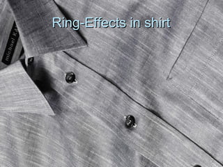 This document appears to be a presentation on different types of yarn and fabric effects, including ring effects, OE effects, slub effects, and injected effects. There are over 60 slides with images showing these effects on yarn boards and in fabric samples. The presentation discusses applying various effects to fabrics for items like shirts, jeans, and home textiles. It aims to showcase the possibilities of special effect yarns and how they can be used to create textiles with unique textures and patterns.
