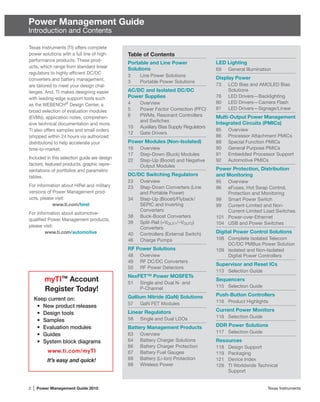 The document provides an overview and selection guide for Texas Instruments' portfolio of isolated AC/DC and DC/DC power supply solutions. It describes various power factor correction, PWM, and isolated DC/DC controller and switcher ICs covering applications from 50W to multi-kilowatt power levels. Design considerations and featured products are highlighted for PFC controllers, PWM controllers, resonant controllers, switchers, and other isolated power solutions.