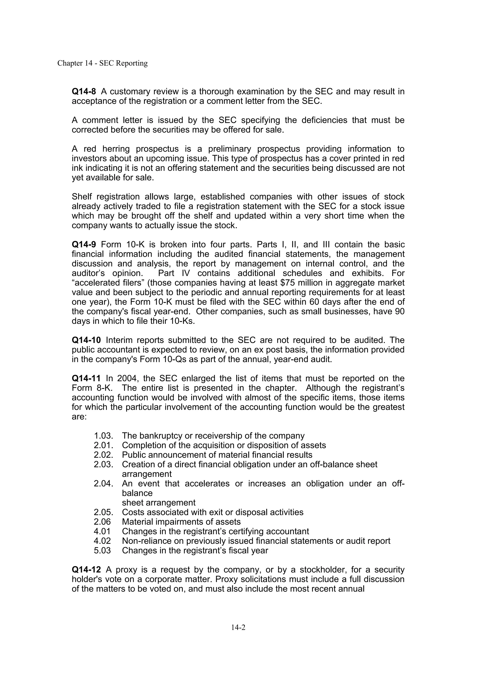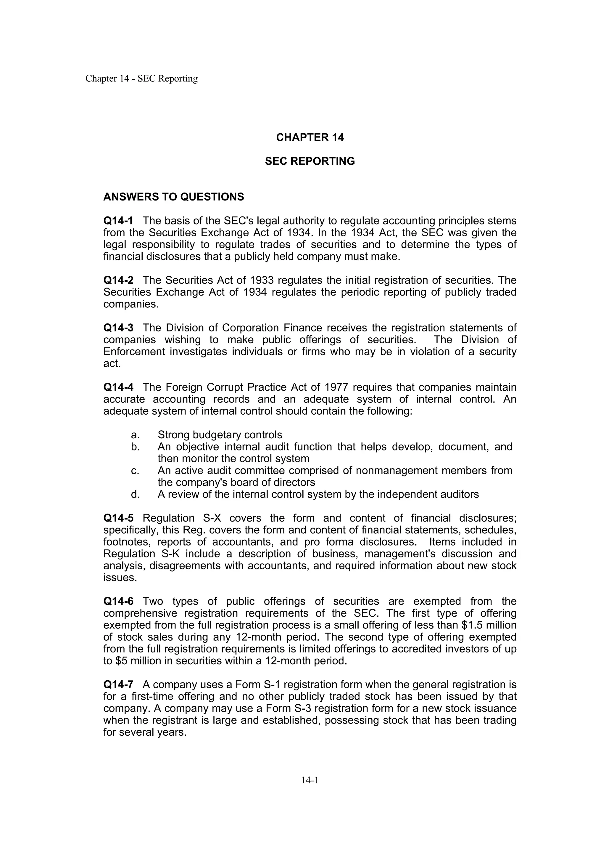 The document discusses SEC reporting requirements for public companies. It provides answers to multiple-choice questions covering topics such as the legal authority of the SEC, securities acts of 1933 and 1934, SEC forms like 10-K and 8-K, registration statements, and the Foreign Corrupt Practices Act. It also includes solutions to cases analyzing objectives of securities acts, roles of the SEC and FASB, information in proxy statements, and required disclosures in Form 10-Ks.