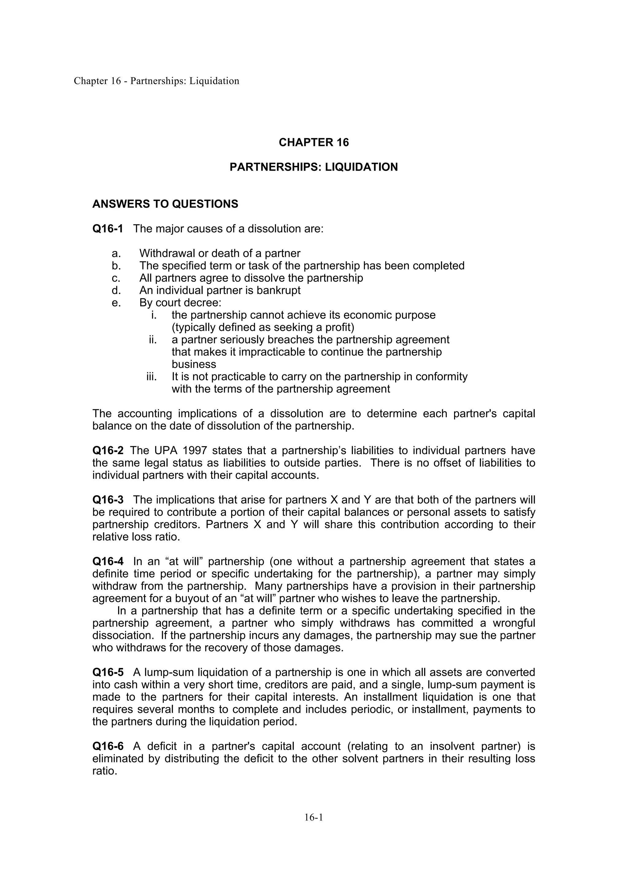 Chapter 16 discusses the dissolution and liquidation of partnerships, detailing reasons for dissolution and the accounting implications, including how partners' capital balances are assessed and liabilities managed. It explains different liquidation methods, such as lump-sum and installment liquidations, and the legal considerations for partner contributions during this process. The chapter emphasizes the importance of having a clear partnership agreement to address potential disputes during liquidation, as well as the implications of partner withdrawals and the distribution of remaining assets.