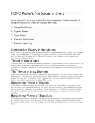 HDFC Porter's five forces analysis examines the competitive environment of HDFC Bank within the Indian banking industry. The five competitive forces are: 1) competitive rivalry among HDFC Bank and competitors like ICICI Bank, Axis Bank, and Yes Bank, 2) moderate to high bargaining power of suppliers, 3) high bargaining power of buyers given options to switch banks, 4) low threat of new entrants due to regulations and trust in established banks, and 5) limited threat of substitutes as finance services are essential for businesses.