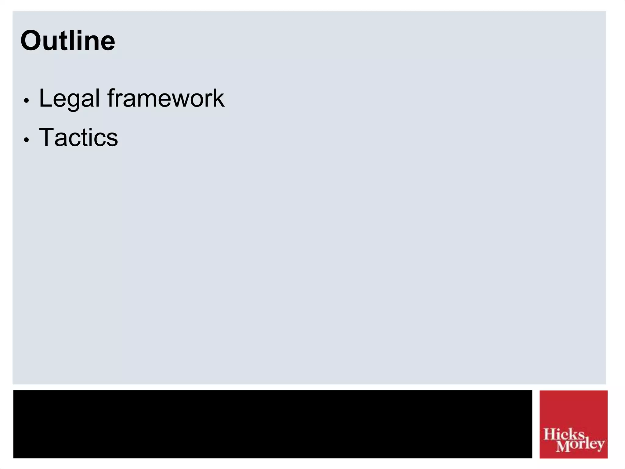The document discusses the legal framework and tactics involved in using the internet as a corporate security resource, focusing on privacy laws such as PIPEDA and investigation tactics like background checks and intelligence gathering. It emphasizes the importance of balancing privacy rights with corporate investigation needs, outlining various tactics and their associated risk scores. Additionally, it highlights the need for ethical considerations and legal compliance in information collection processes.