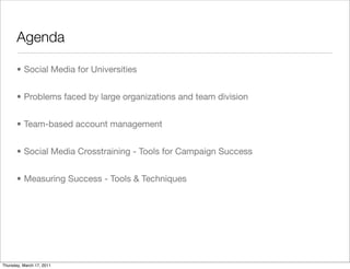 The document discusses using social media for large organizations like universities. It outlines the agenda which includes topics like problems faced by large organizations in managing social media, using a team-based approach, measuring success, and tools that can help with campaign success. It then discusses in more detail how universities can use social media to boost enrollment by engaging with prospective students and current students in ways that are more influential than traditional marketing.
