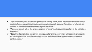 This document discusses social media advertising and marketing. It covers key topics such as how social media can build brand awareness, the importance of customer engagement and service, and how to measure the return on investment of social media campaigns. Examples are provided of both successful and unsuccessful social media marketing campaigns from brands like Wendy's, KFC, and Blackberry. The document emphasizes that brands must adapt to changing technologies and find ways to authentically engage customers through social conversations in order to build loyalty and influence purchase decisions.