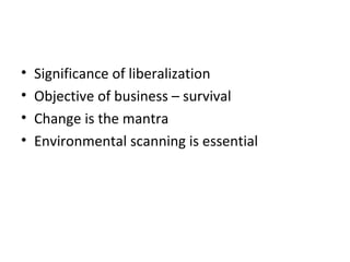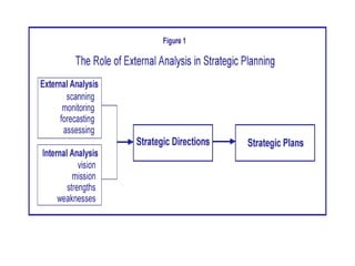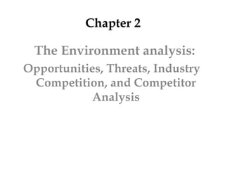 The document discusses analyzing a firm's environment and competitors. It covers analyzing a firm's mega, micro, and relevant environments. It also discusses SWOT analysis, Porter's five forces model, and competitor analysis. The purpose is to understand opportunities/threats in the external environment, industry competition, and competitors' strategies to develop an effective strategy.