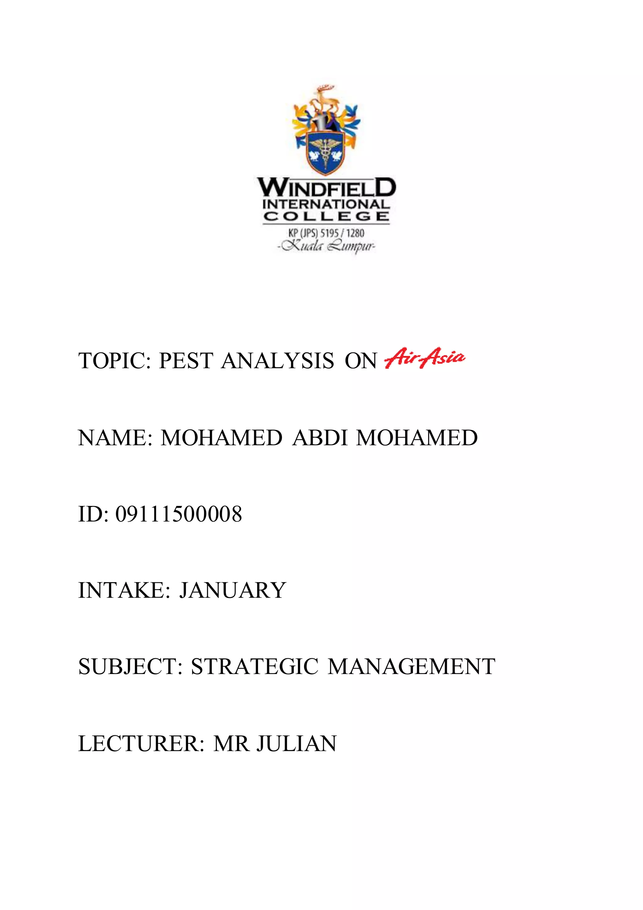The document discusses a PEST analysis that was conducted on Air Asia, a leading low-cost carrier in Southeast Asia. It begins by explaining what a PEST analysis is and the four factors that are analyzed: political, economic, social, and technological. It then provides details of Air Asia's PEST analysis, examining how factors like government policies, GDP, lifestyle trends, and smartphone usage affect the company. The analysis concludes by noting some benefits of conducting a PEST analysis, such as identifying threats, opportunities, and implications of entering new markets.