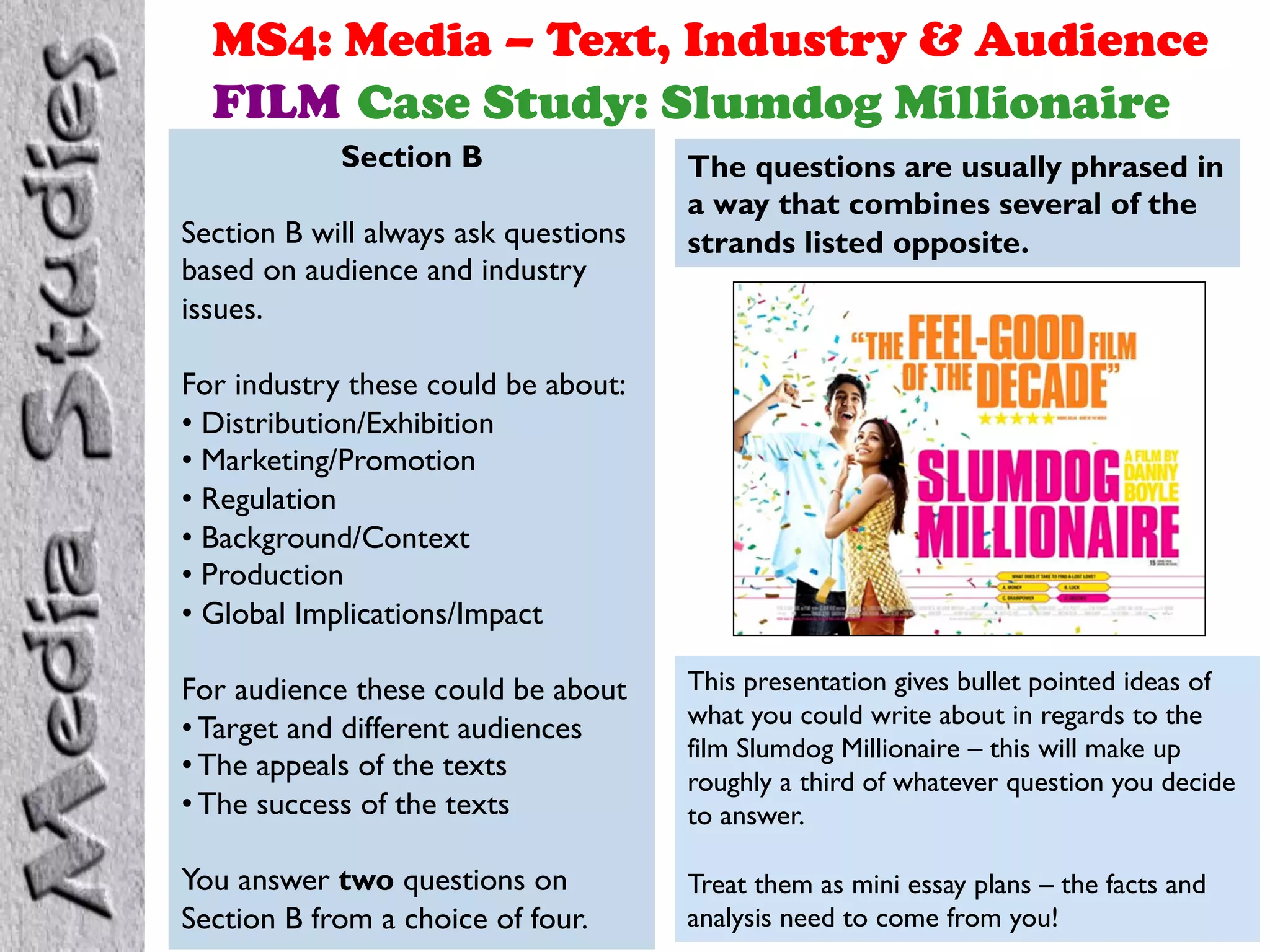 This document provides guidance for answering questions in Section B of a case study exam on the film Slumdog Millionaire. Section B will ask two questions focusing on either the film industry or its audiences. Industry questions may address distribution, marketing, regulation, production or global impact. Audience questions may cover target demographics, audience appeal or the film's success. Students will choose two of four questions to answer, combining different factors like distribution and regulation. The document offers potential topics to discuss but expects students to provide their own analysis.