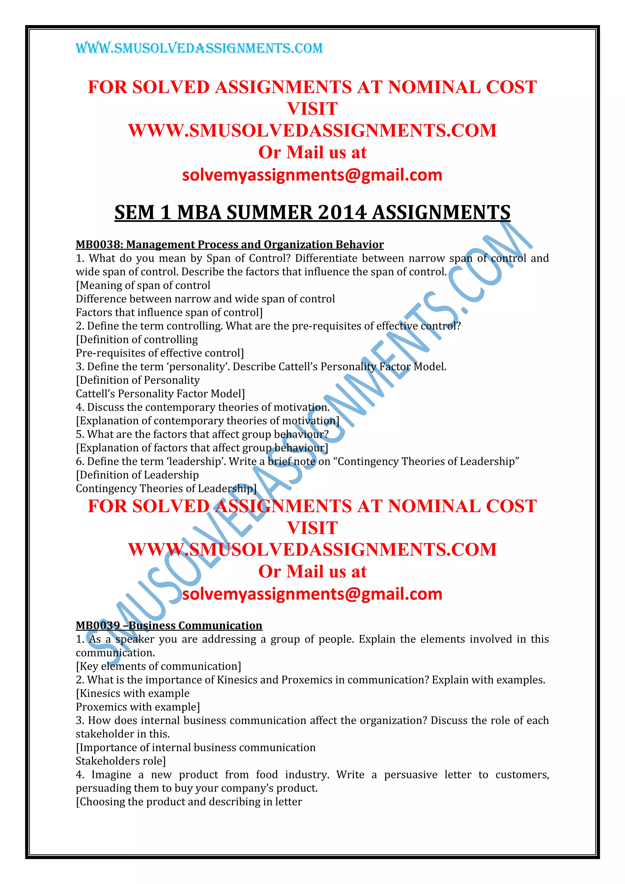 This document provides information about an online service that solves MBA assignments for nominal costs. It lists assignments from MBA semesters 1 and 2 covering subjects like management, statistics, economics, accounting, and human resources. For each assignment, it includes brief descriptions of the questions addressed. It directs readers to the website or email to obtain solved assignments.