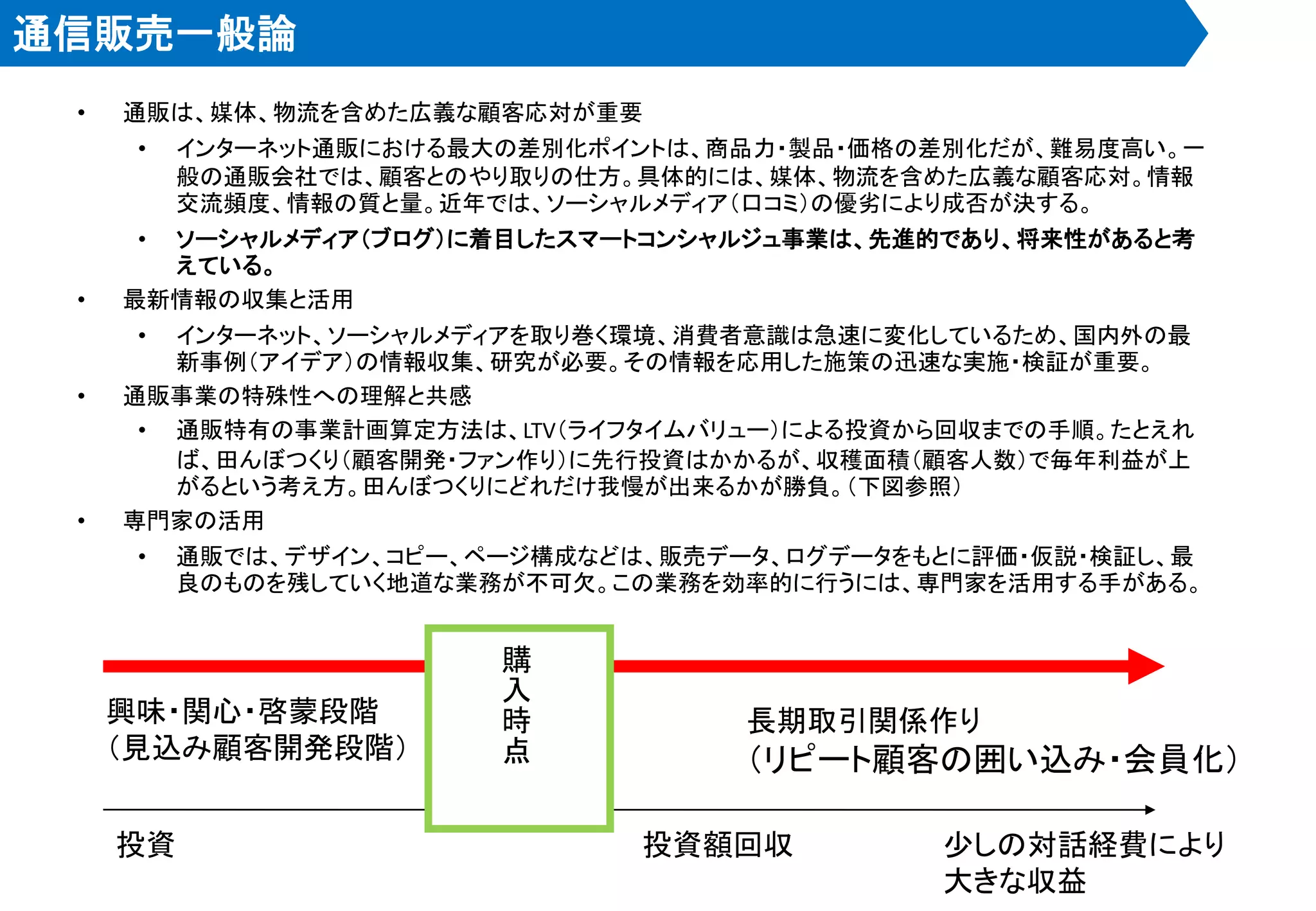 通販は、媒体、物流を含めた広義な顧客応対が重要 • インターネット通販における最大の差別化ポイントは、商品力・製品・価格の差別化だが、難易度高い。一 般の通販会社では、顧客とのやり取りの仕方。具体的には、媒体、物流を含めた広義な顧客応対。情報 交流頻度、情報の質と量。近年では、ソーシャルメディア'口コミ(の優务により成否が決する。 •ソーシャルメディア'ブログ(に着目したスマートコンシャルジュ事業は、先進的であり、将来性があると考 えている。 • 最新情報の収集と活用 • インターネット、ソーシャルメディアを取り巻く環境、消費者意識は急速に変化しているため、国内外の最 新事例'アイデア(の情報収集、研究が必要。その情報を応用した施策の迅速な実施・検証が重要。 • 通販事業の特殊性への理解と共感 • 通販特有の事業計画算定方法は、LTV'ライフタイムバリュー(による投資から回収までの手順。たとえれ ば、田んぼつくり'顧客開発・ファン作り(に先行投資はかかるが、収穫面積'顧客人数(で毎年利益が上 がるという考え方。田んぼつくりにどれだけ我慢が出来るかが勝負。'下図参照( • 専門家の活用 • 通販では、デザイン、コピー、ページ構成などは、販売データ、ログデータをもとに評価・仮説・検証し、最 良のものを残していく地道な業務が不可欠。この業務を効率的に行うには、専門家を活用する手がある。 購 入 興味・関心・啓蒙段階 時 長期取引関係作り '見込み顧客開発段階( 点 'リピート顧客の囲い込み・会員化( 投資 投資額回収 尐しの対話経費により 大きな収益