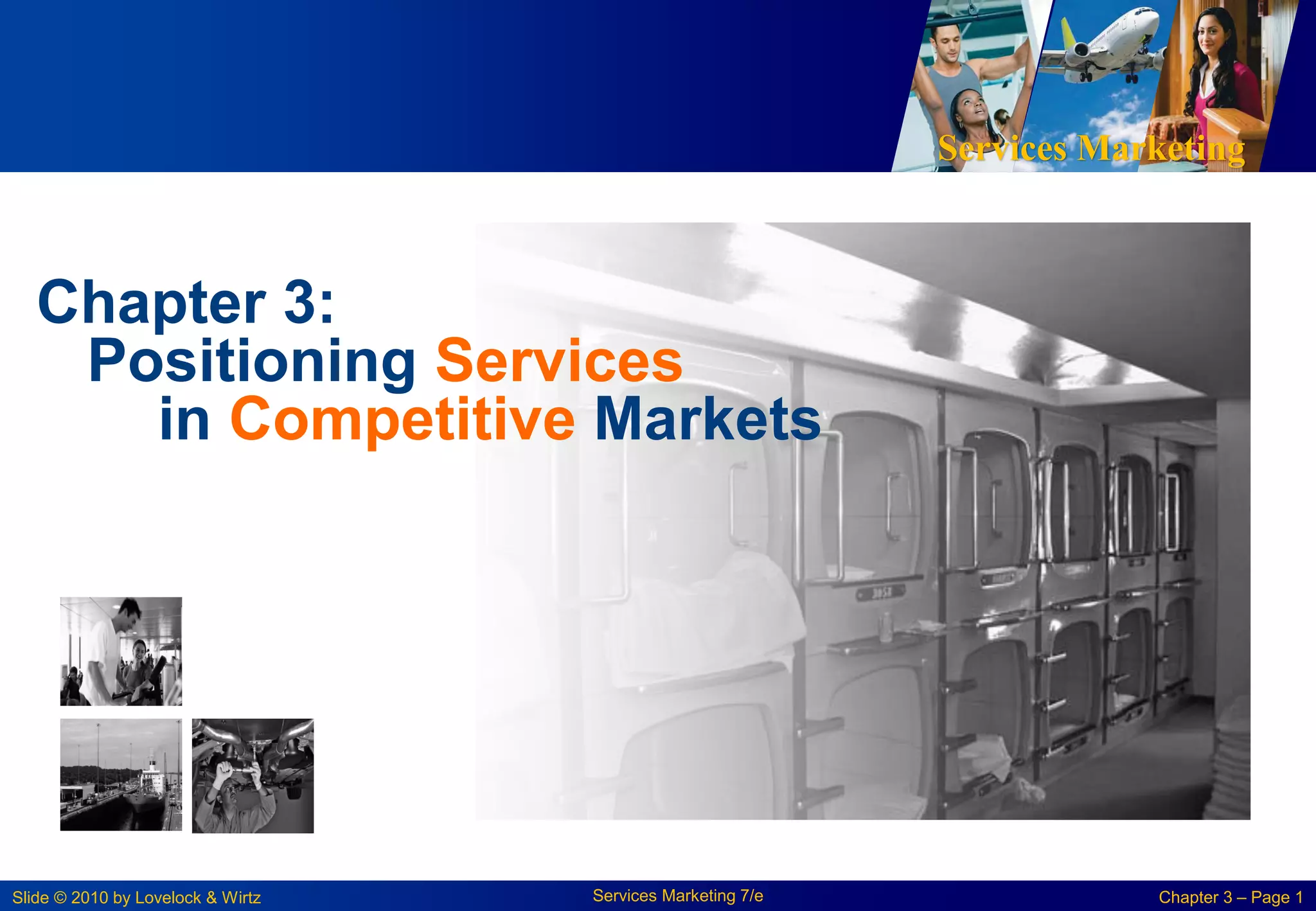 This document discusses positioning services in competitive markets. It covers focus strategies like fully focused, service focused, and market focused approaches. It also discusses market segmentation, determining important service attributes, developing an effective positioning strategy through analyzing markets, competitors, and internal strengths. Positioning maps are presented as a tool to visualize competitive positioning on attributes and analyze potential responses to strategic changes.